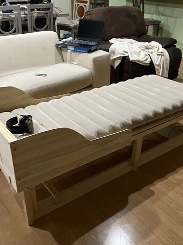 This Gift is a Lounge that you lay on and recieve a Frequency massage from head to toe. This lounge is designed to fit into any furniture layout or room where a place to streach out is needed. It fits in well! This is designed to energize and relax your internal stress due to negative energies that you have been surrounded with in your daily life outside of your home or for that matter at home. It creates relaxing frequency energy that comes from the suspended wooden table that sits upon vibration isolators that help the frequencies from composed frequency music penetrate your body from underneath. The frequency creates a massage like feeling from head to toe that will remove the negative energy and set you into a relaxed and zen like state of being. These are all energies you have to accept into your life if you want them to have a lasting effect!